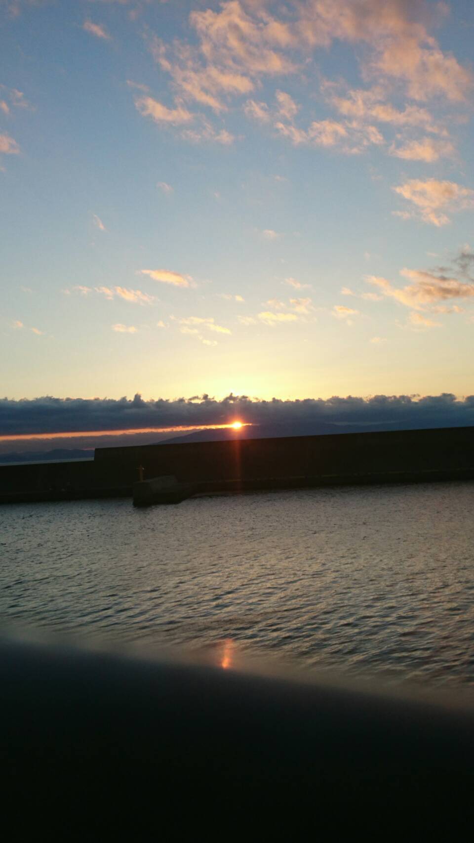 天城連山と雲間に光るご来光海面に写る太陽も、一点を照らす